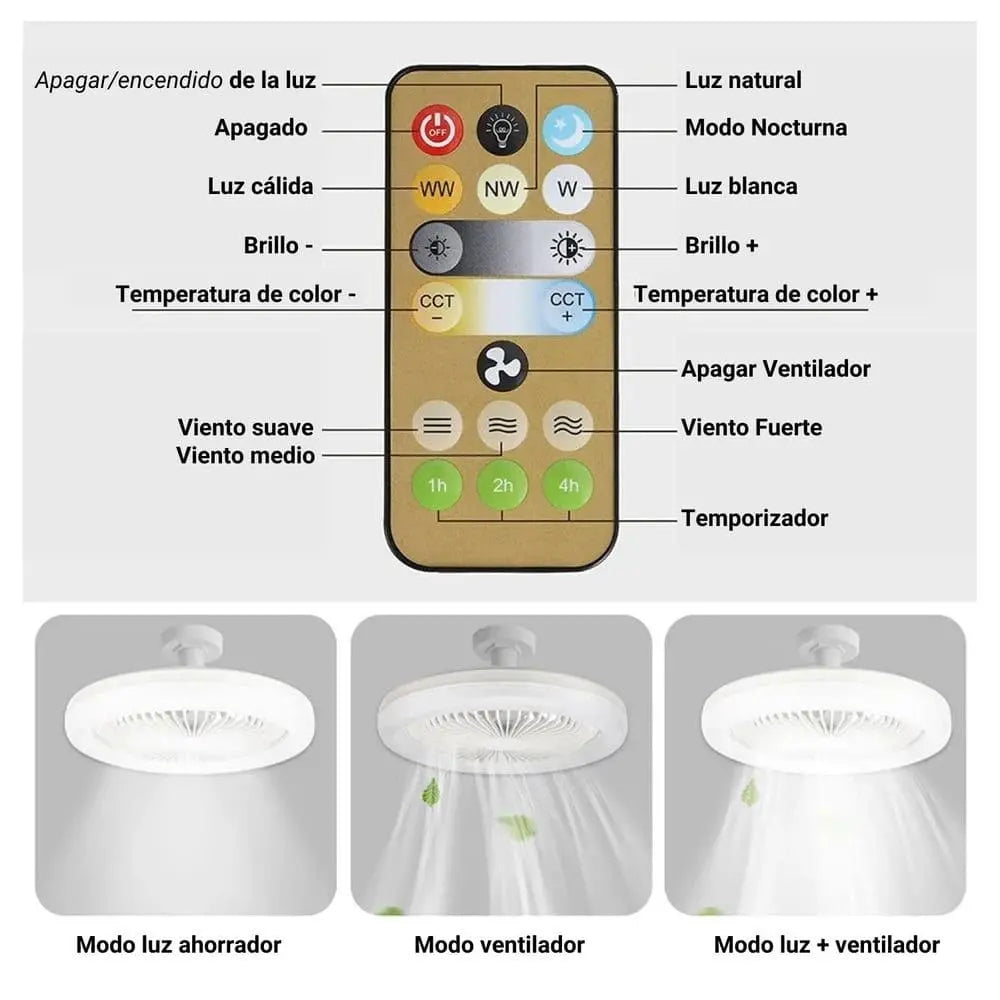 Enrosca el foco ventilador en un casquillo E27(rosca estándar). Conecta la corriente como si fuera un foco normal. Usa el control remoto para elegir: 💨 La velocidad del ventilador (baja, media o alta) 💡 El tipo de luz (blanca fría, neutra o cálida)⏱️Configura el temporizador si lo deseas.