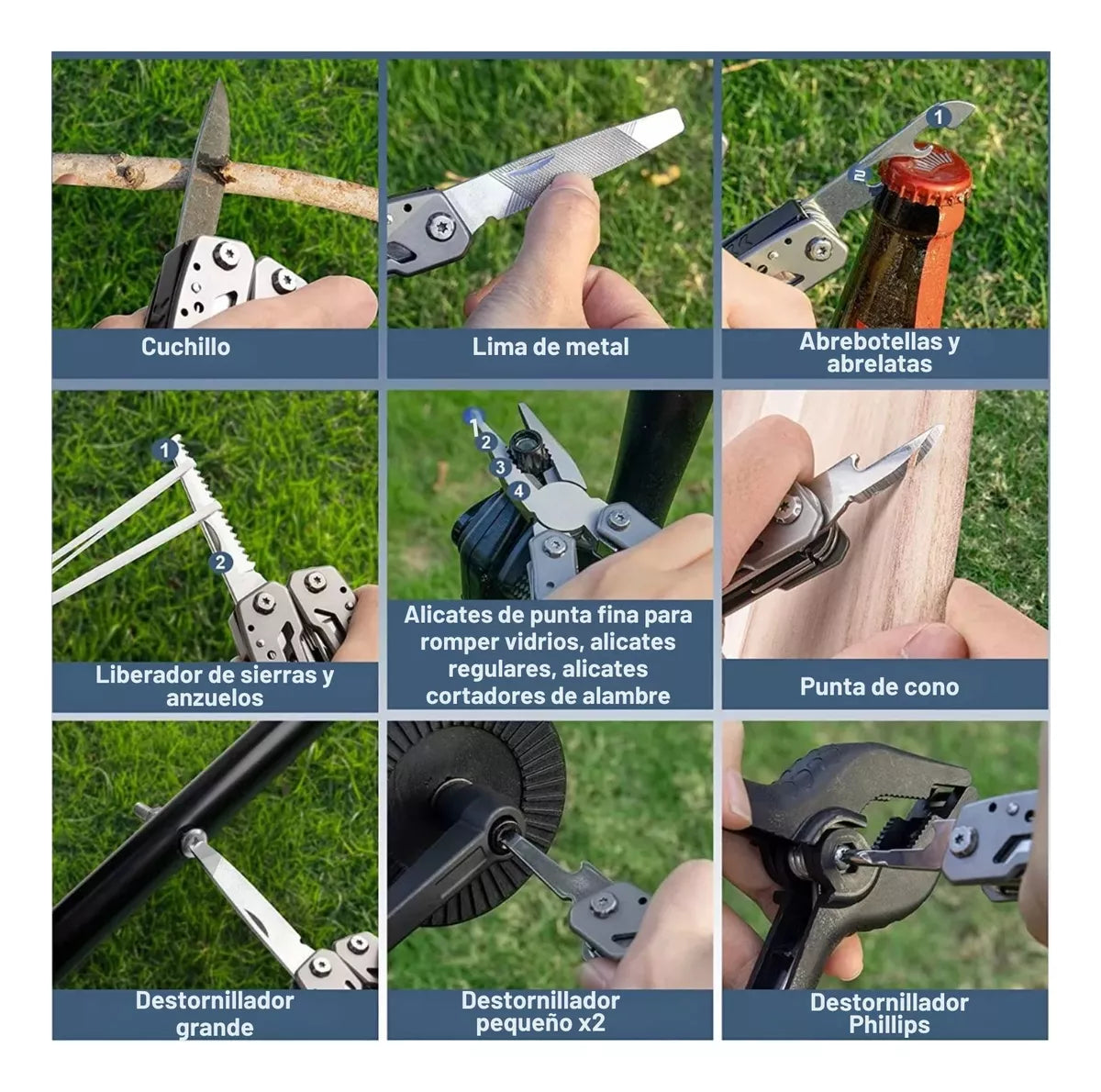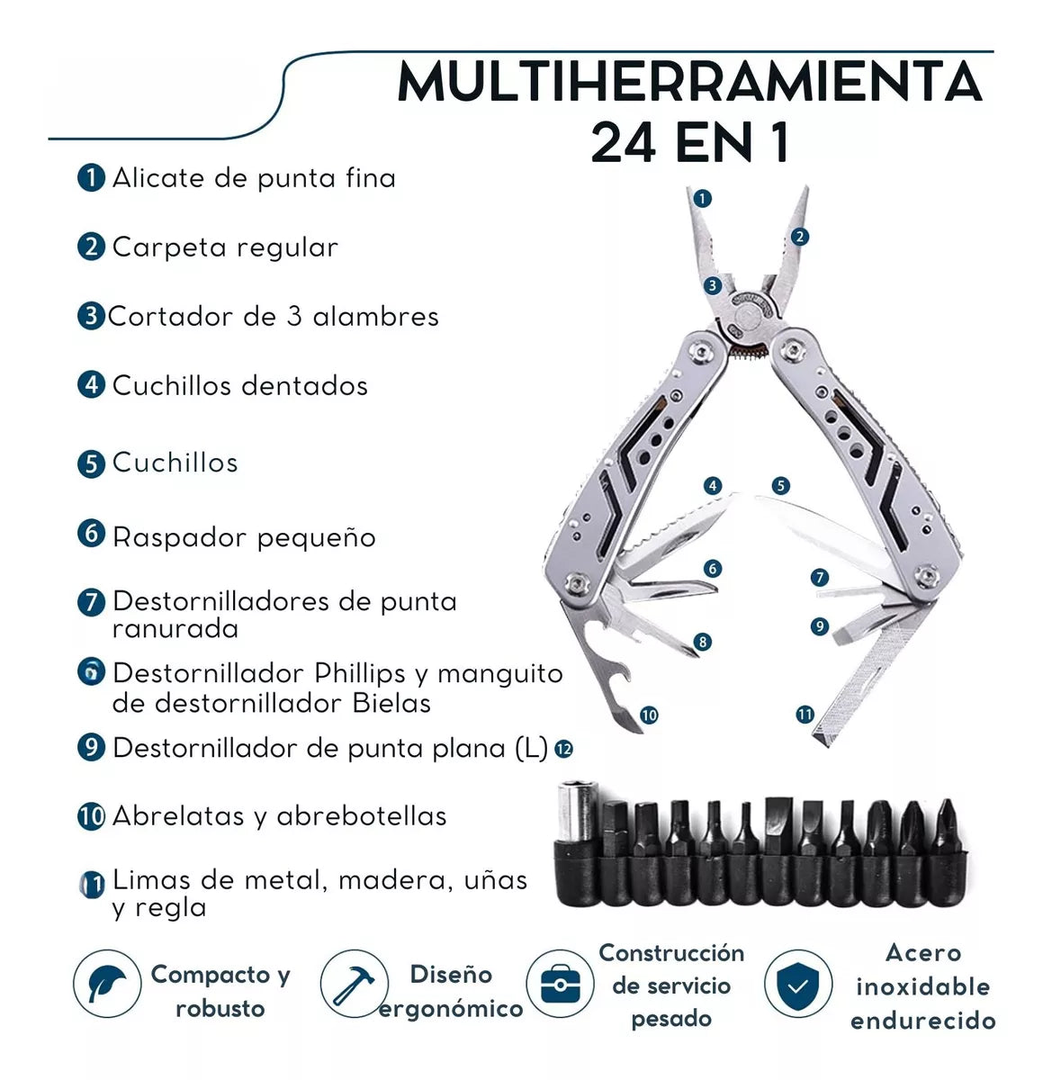 ✅ Alicate 24 en 1: alicates, cuchillos, destornilladores y más, todo en una aleación ultra resistente.